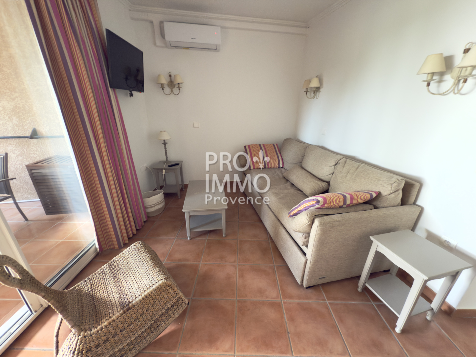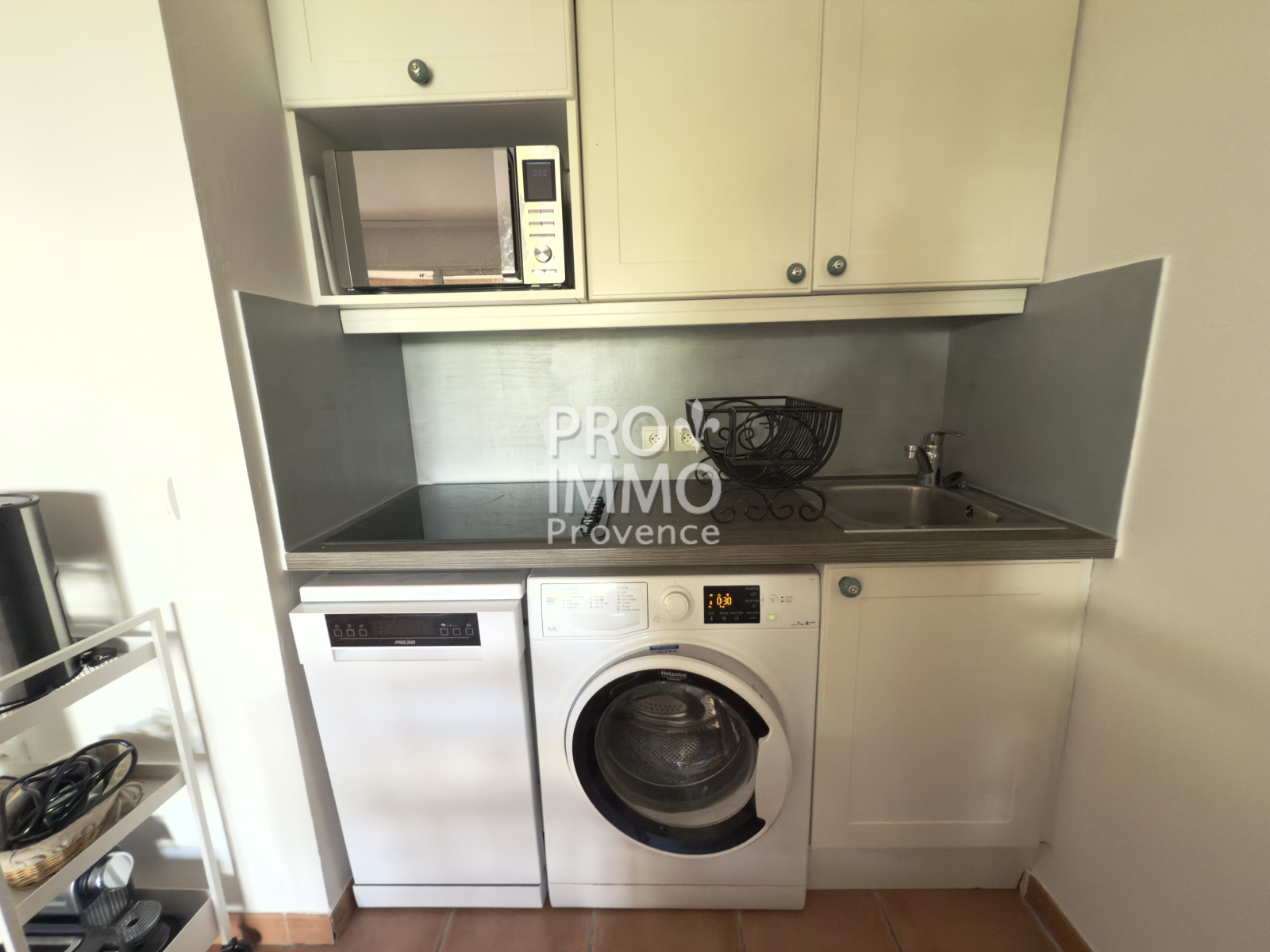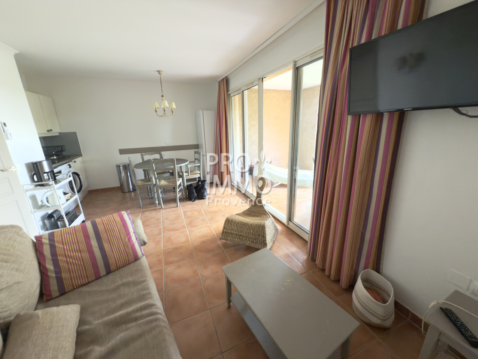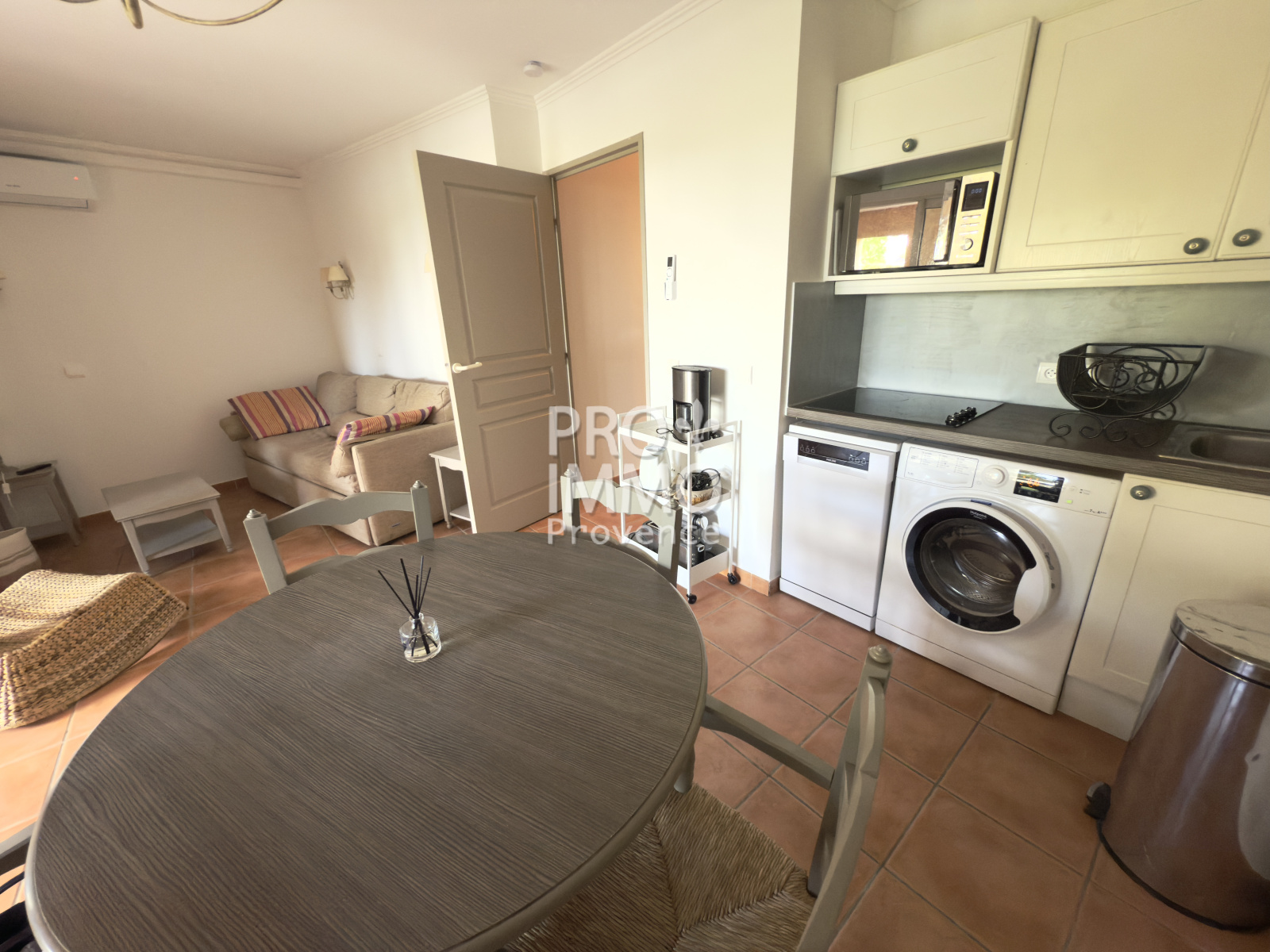 Séjour lumineux avec kitchenette équipée (micro-ondes combiné four, lave-vaisselle et lave linge)